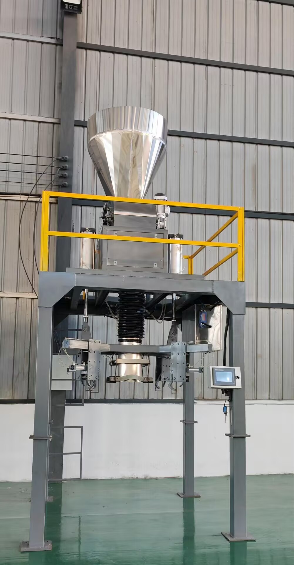 上海鑄衡工廠生產(chǎn)的這臺(tái)鉀肥噸袋自動(dòng)噸包機(jī)采用單/雙螺旋強(qiáng)制給料控制系統(tǒng),無(wú)級(jí)變頻調(diào)速控制給料速度,快速給料由大小螺旋快速進(jìn)料,慢速給料由小螺旋精加料完成,結(jié)合精度控制閥實(shí)現(xiàn)包裝速度和精度的自動(dòng)控制,性能穩(wěn)定可靠。灌裝時(shí)只需人工掛袋,給定信號(hào)后,便可完成自動(dòng)灌裝、自動(dòng)計(jì)量、滿稱時(shí)自動(dòng)停機(jī)、松袋的工作循環(huán), 由叉車或輸送機(jī)直接輸出后吊裝儲(chǔ)運(yùn)。